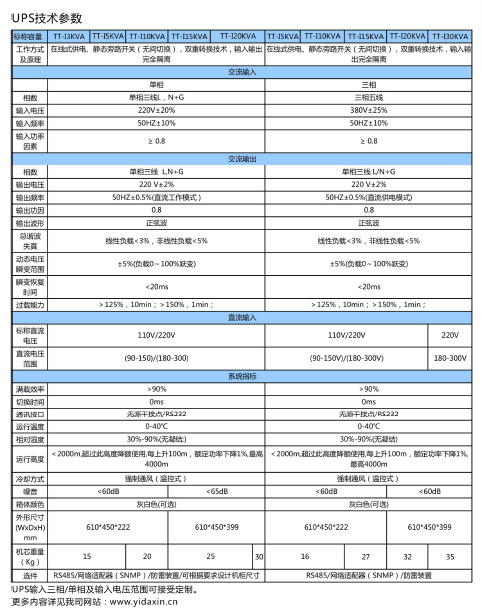 易达新TT-I系列交流不间断电源覆盖单进单出/三进单出/三进三出容量1KVA到400KVA全系列规格。其显著的优势如下: