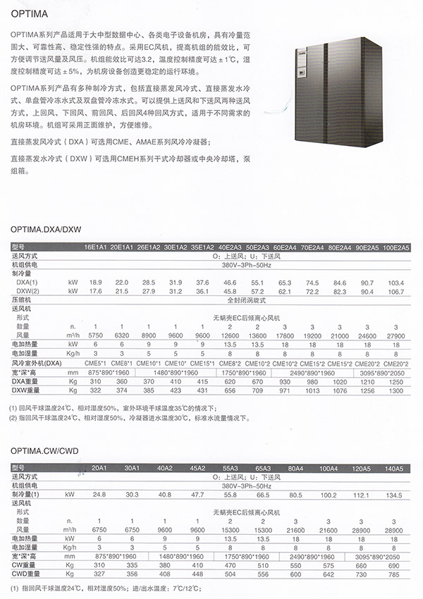 OPTIMA家族机房专用空调机组为机房提供精密的温度和湿度控制,具有极高的可靠性、稳定性以及节能性,满足24×7全天候连续运行要求,是绿色数据中心与各类电子设备机房的理想选择。OPTIMA家族机房专用空调机组有多种制冷方式,包括直接蒸发风冷式、直接蒸发水冷式、单盘管冷冻水式及双盘管冷冻水式。容量为17.6kW~134.5kW。